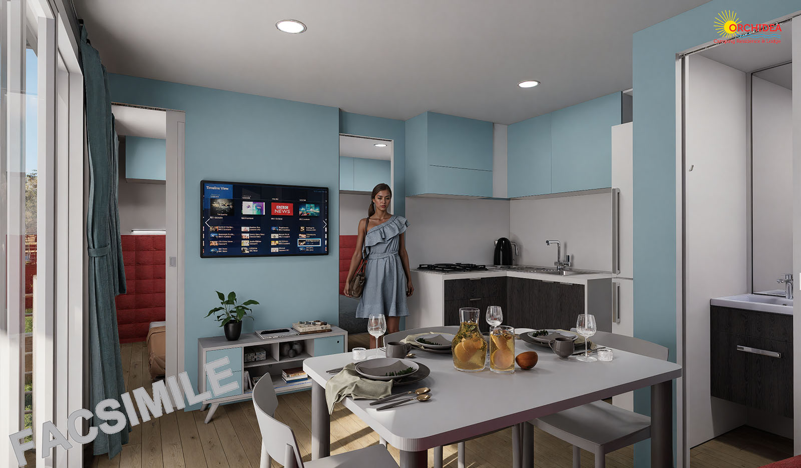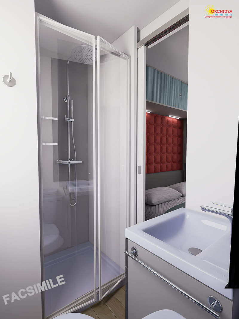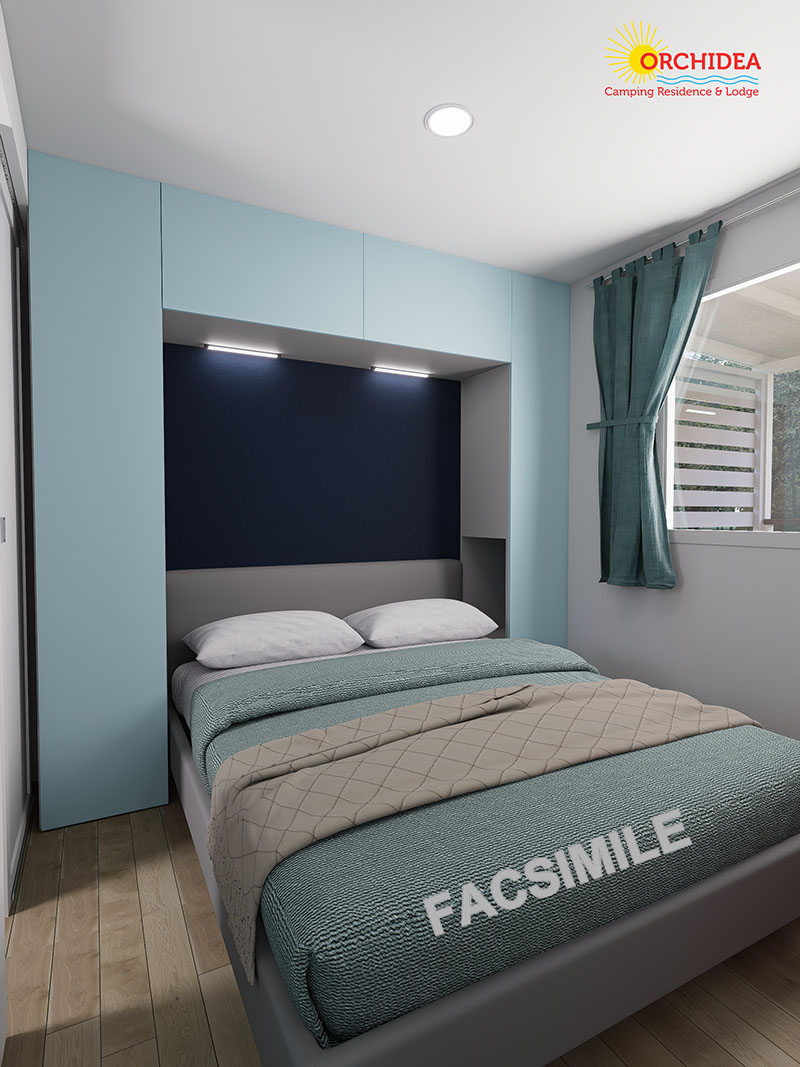 Mini Suite 5.20mt x 4.00mt Stacaravans | Max. 2 mensen + 1 kind (0-2 Jaar) 1 tweepersoonskamer (bed 190cm x 160cm), sofa, badkamer met douche en wastafel. Volledig ingerichte keuke