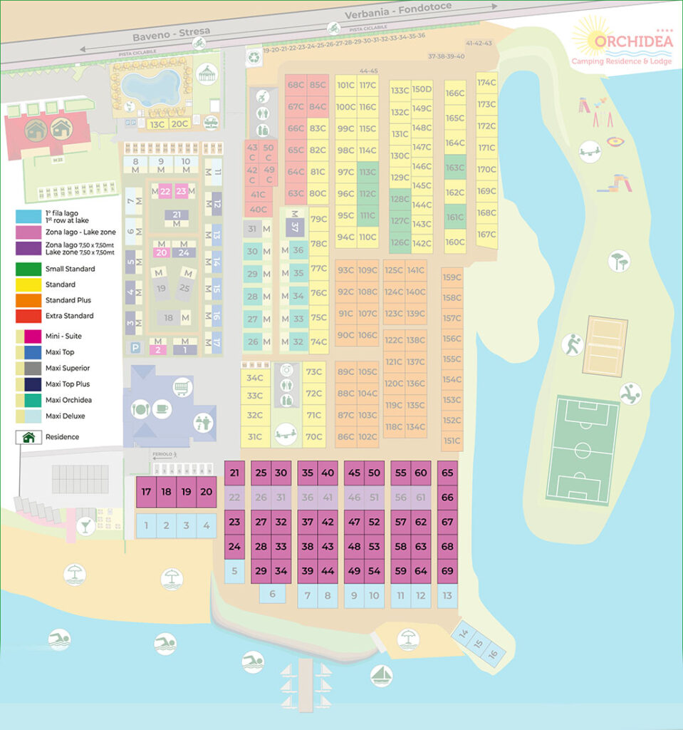 Op de plattegrond van de camping van nr. 17 tot nr. 69.