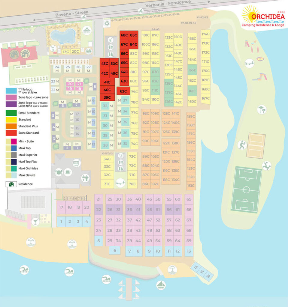 Zona lago 7.50mt x 7.50mt Piazzole | Max. 5 persone | 56m2 Piazzola con parziale vista lago, carico acqua diretto in piazzola (attenzione solo carico acqua no scarico acqua diretto